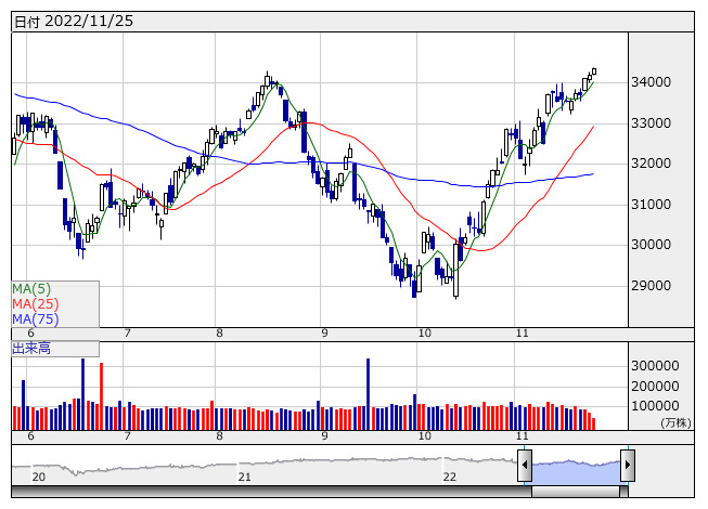 NYダウ <日足> 「株探」多機能チャートより― ダウは152ドル高と3日続伸、利上げペース減速や年末商戦への期待が相場をサポート ―