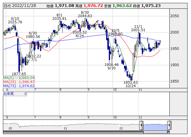 2022年11月29日08時54分 【市況】東証REIT指数先物:29日寄り付き=4ポイント高、1977ポイント REIT指数 <日足> 「株探」多機能チャートより 29日8時53分、東証REIT指数先物期近2022年12月限は前日清算値比4ポイント高の1977ポイントで寄り付いた。前日の東証REIT指数の現物終値1975.23ポイントに対しては1.77ポイント高。 株探ニュース