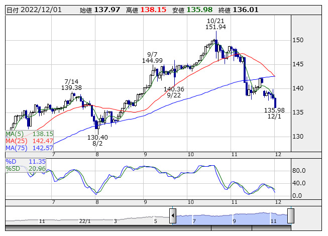 2022年12月02日08時01分 【通貨】外為:1ドル135円31銭前後と大幅なドル安・円高で推移 米ドル/円 <日足> Slowストキャス 「株探」多機能チャートより 2日の外国為替市場のドル円相場は午前8時時点で1ドル=135円31銭前後と、前日午後5時時点に比べ1円23銭の大幅なドル安・円高。ユーロ円は1ユーロ=142円38銭前後と38銭のユーロ高・円安で推移している。 株探ニュース