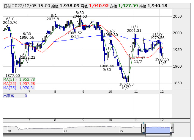 2022年12月05日15時17分 【市況】東証REIT指数先物:5日清算値=変わらず、1940ポイント REIT指数 <日足> 「株探」多機能チャートより 5日15時15分、東証REIT指数先物期近2022年12月限は前週末清算値比変わらずの1940ポイントで取引を終えた。出来高は81枚だった。この日の東証REIT指数の現物終値1940.18ポイントに対しては0.18ポイント安。 株探ニュース