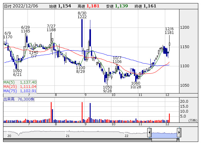 不二電機 <日足> 「株探」多機能チャートより12月6日の大引け後に決算を発表した銘柄のなかから、業績好調や配当増額など市場で評価される可能性の高い銘柄を取り上げた。