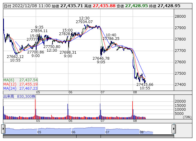 【市況】11時の日経平均は250円安の2万7435円、ファストリが44.52円押し下げ