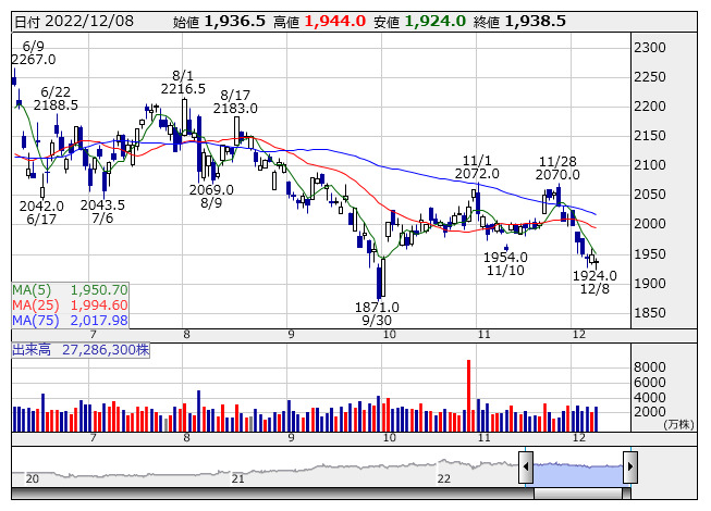 <7203> トヨタ 212564 ( 1,094) 1,943 +4.5 ( +0.2%)