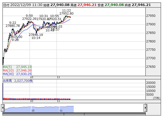 【市況】日経225先物:9日正午=380円高、2万7870円