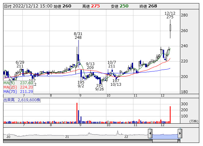 ジェイテック <日足> 「株探」多機能チャートより個別ではジェイテック<2479>、サンワカンパニー<3187>、ビリングシステム<3623>、くふうカンパニー<4376>、キャンバス<4575>など10銘柄が年初来高値を更新。Sun Asterisk<4053>、クリングルファーマ<4884>、リプロセル<4978>、Branding Engineer<7352>、日本スキー場開発<6040>は値上がり率上位に買われた。