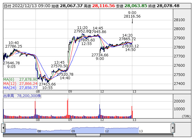 2022年12月13日09時03分 【市況】日経平均が12日ぶり2万8000円台回復 日経平均 <5分足> 「株探」多機能チャートより 日経平均株価が1日以来、12日ぶりに2万8000円台を回復した。09時02分現在、274.23円高の2万8116.56円まで上昇している。 株探ニュース