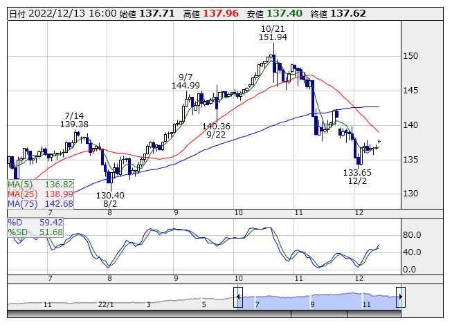 2022年12月13日16時01分 【通貨】外為:1ドル137円62銭前後と大幅なドル高・円安で推移 米ドル/円 <日足> Slowストキャス 「株探」多機能チャートより 13日の外国為替市場のドル円相場は午後4時時点で1ドル=137円62銭前後と、前日午後5時時点に比べ95銭の大幅なドル高・円安。ユーロ円は1ユーロ=145円16銭前後と1円32銭の大幅なユーロ高・円安で推移している。 株探ニュース