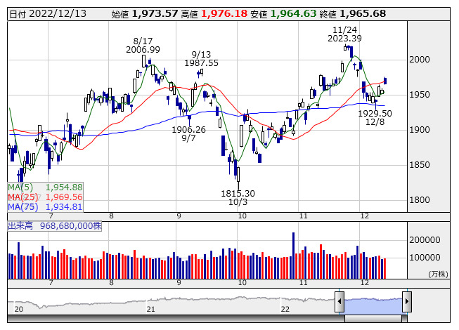 2022年12月14日08時46分 【市況】TOPIX先物:14日寄り付き=6ポイント高、1968.5ポイント TOPIX <日足> 「株探」多機能チャートより 14日8時45分、TOPIX先物期近2023年3月限は前日清算値比6ポイント高の1968.5ポイントで寄り付いた。前日のTOPIXの現物終値1965.68ポイントに対しては2.82ポイント高。夜間取引の終値1969.5ポイントに対しては1ポイント安となっている。 株探ニュース