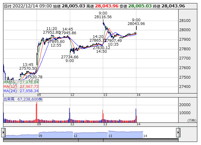 2022年12月14日09時02分 【市況】日経平均14日寄り付き=50円高、2万8005円 日経平均 <5分足> 「株探」多機能チャートより 14日の日経平均株価は前日比50.18円高の2万8005.03円で寄り付いた。 株探ニュース