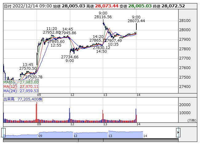2022年12月14日09時03分 【市況】日経平均の上げ幅が100円突破 日経平均 <5分足> 「株探」多機能チャートより 日経平均株価の上げ幅が100円を突破。9時2分現在、118.59円高の2万8073.44円まで上昇している。 株探ニュース