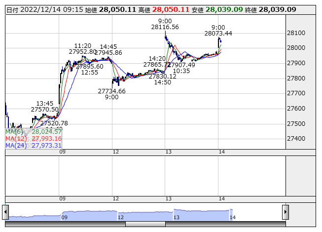 日経平均 <5分足> 売買代金 「株探」多機能チャートより目立った値動きでは国際のETF VIX短期先物指数 <1552> は5.12%安、WisdomTree ニッケル上場投資信託 <1694> は4.99%安と大幅に下落。