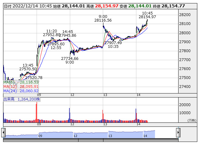 2022年12月14日10時46分 【市況】日経平均の上げ幅が200円突破 日経平均 <5分足> 「株探」多機能チャートより 日経平均株価の上げ幅が200円を突破。10時45分現在、200.12円高の2万8154.97円まで上昇している。 株探ニュース