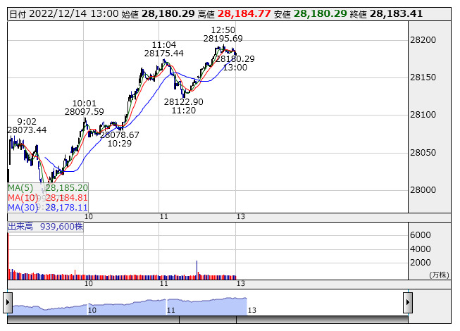 【市況】13時の日経平均は229円高の2万8184円、東エレクが40.41円押し上げ