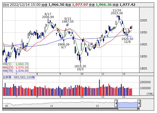 2022年12月14日15時17分 【市況】TOPIX先物:14日清算値=8ポイント高、1970.5ポイント TOPIX <日足> 「株探」多機能チャートより 14日15時15分、TOPIX先物期近2023年3月限は前日清算値比8ポイント高の1970.5ポイントで取引を終えた。出来高は4万5144枚だった。この日のTOPIXの現物終値1977.42ポイントに対しては6.92ポイント安。 株探ニュース