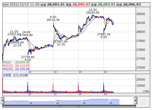 【市況】11時の日経平均は61円安の2万8094円、ファストリが10.27円押し下げ