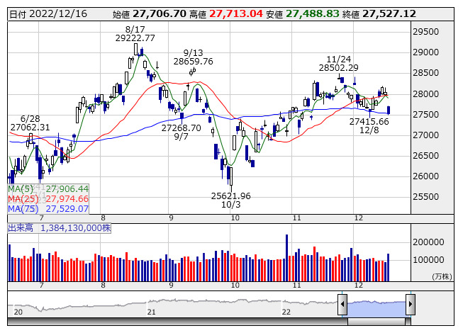 2022年12月19日06時55分 【市況】シカゴ日経平均先物 大取終値比 190円安 (12月16日) 日経平均 <日足> 「株探」多機能チャートよりシカゴ日経225先物3月限 (円建て) 27280 ( -190 ) シカゴ日経225先物3月限 (ドル建て) 27300 ( -170 ) ※( )は大阪取引所終値比 株探ニュース