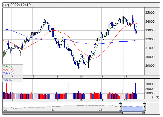 NYダウ <日足> 「株探」多機能チャートより20日の日本株市場は、やや売り先行で始まった後は、こう着感の強い相場展開になりそうだ。19日の米国市場はNYダウが162ドル安だった。米連邦準備制度理事会(FRB)による利上げ継続が景気を冷やすとの景気後退懸念が相場の重荷となったほか、厳しいマクロ環境への警戒から企業業績への懸念も生まれた。長期金利が上昇しハイテク株が売られた一方、原油価格の上昇でエネルギー銘柄には買いが入った。シカゴ日経225先物清算値は大阪比50円安の27170円。円相場は1ドル136円80銭台で推移している。