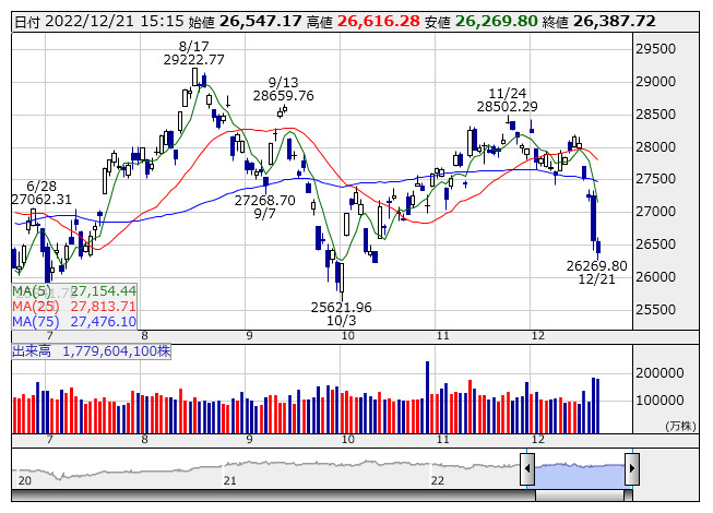 【市況】【↓】日経平均 大引け| 5日続落、日銀金融政策修正の影響で売り継続 (12月21日)