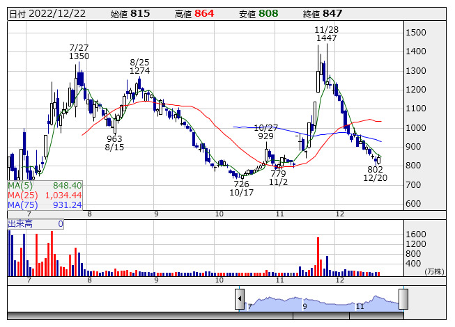 坪田ラボ <日足> 「株探」多機能チャートより22日前場 ストップ高: 7銘柄 ストップ安: 0銘柄 (気配、一時を含む)