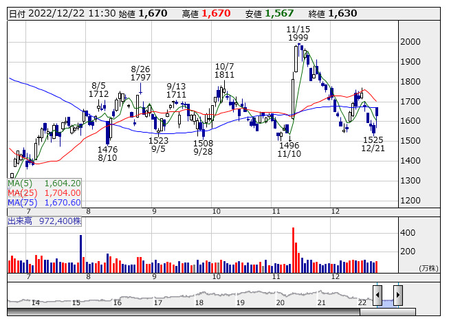西松屋チェーン<7545>はしっかり。21日の取引終了後に発表した12月度(11月21日~12月20日)の月次売上高速報で、既存店売上高が前年同月比1.1%増と2カ月ぶりに前年実績を上回ったことが好材料視されている。月度の中頃以降に気温が低下したことで、冬物衣料の売り上げが大きく伸びたことが牽引した。なお、全店売上高は同3.7%増だった。