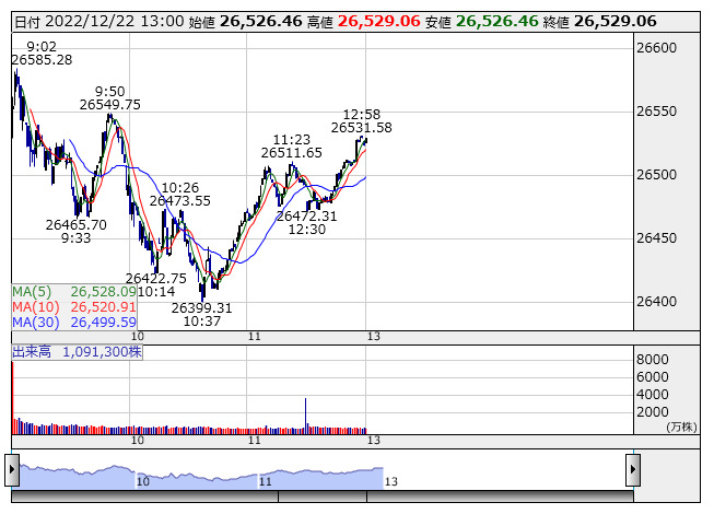 【市況】13時の日経平均は136円高の2万6524円、KDDIが17.05円押し上げ