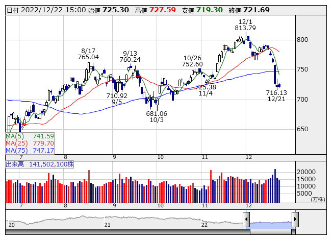 2022年12月22日15時17分 【市況】マザーズ先物:22日清算値=変わらず、716ポイント マザーズ指数 <日足> 「株探」多機能チャートより 22日15時15分、東証マザーズ指数先物期近2023年3月限は前日清算値比変わらずの716ポイントで取引を終えた。出来高は5555枚だった。この日の東証マザーズ指数の現物終値721.69ポイントに対しては5.69ポイント安。 株探ニュース