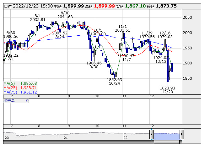 2022年12月23日15時17分 【市況】東証REIT指数先物:23日清算値=13ポイント安、1851ポイント REIT指数 <日足> 「株探」多機能チャートより 23日15時15分、東証REIT指数先物期近2023年3月限は前日清算値比13ポイント安の1851ポイントで取引を終えた。出来高は432枚だった。この日の東証REIT指数の現物終値1873.75ポイントに対しては22.75ポイント安。 株探ニュース