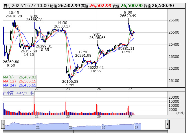 【市況】10時の日経平均は95円高の2万6500円、ファストリが40.75円押し上げ