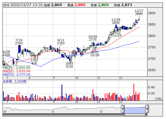 一方、ETSホールディングス<1789>、塩水港精糖<2112>、プラップジャパン<2449>、フュートレック<2468>、ヒビノ<2469>など87銘柄が年初来安値を更新。パレモ・ホールディングス<2778>、まぐまぐ<4059>、扶桑電通<7505>、デュアルタップ<3469>、アテクト<4241>は値下がり率上位に売られた。