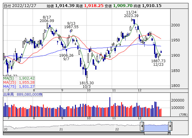2022年12月28日08時46分 【市況】TOPIX先物:28日寄り付き=2.5ポイント安、1902ポイント TOPIX <日足> 「株探」多機能チャートより 28日8時45分、TOPIX先物期近2023年3月限は前日清算値比2.5ポイント安の1902ポイントで寄り付いた。前日のTOPIXの現物終値1910.15ポイントに対しては8.15ポイント安。夜間取引の終値1901ポイントに対しては1ポイント高となっている。 株探ニュース