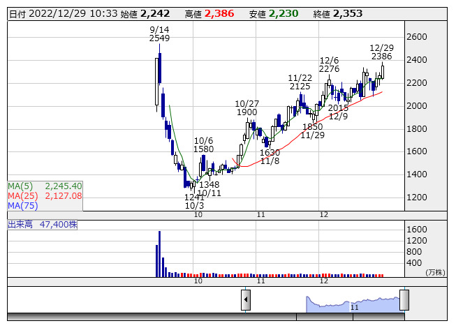 ジャパニアス <日足> 「株探」多機能チャートより今年9月13日に東証グロース市場に上場してまだ3カ月半あまり。セカンダリーでは上場2日目に2549円の高値をつけた後に株価は全体相場の波乱に巻き込まれ急落を余儀なくされたものの、10月以降は安定した上昇波動を形成してきた。22年11月期は売上高が前の期比13%増の81億5300万円、営業利益は同58%増の5億3900万円予想と大幅な伸びを見込むが、一段の上振れが有力視されている。また23年11月期以降も2ケタ成長トレンドは維持されそうだ。