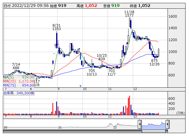 アミタHD <日足> 「株探」多機能チャートより個別ではアミタホールディングス<2195>、ELEMENTS<5246>、ホープ<6195>がストップ高。オープンワーク<5139>、INTLOOP<9556>など4銘柄は年初来高値を更新。BTM<5247>、フィードフォースグループ<7068>、バンク・オブ・イノベーション<4393>、ウェルプレイド・ライゼスト<9565>、i-plug<4177>は値上がり率上位に買われた。