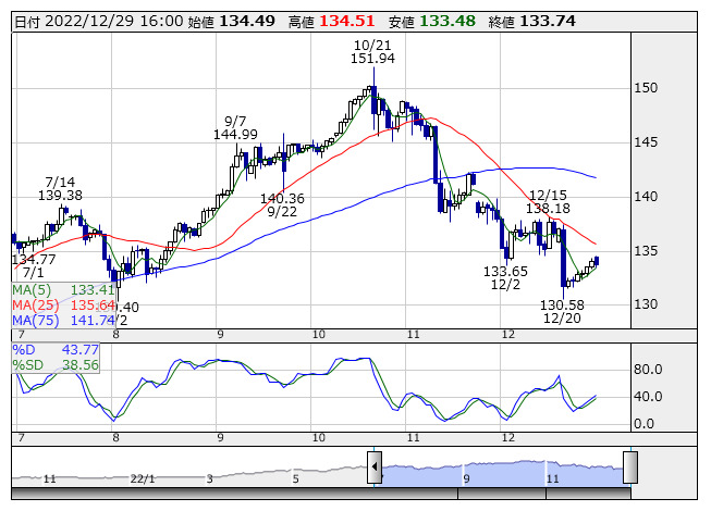 2022年12月29日16時01分 【通貨】外為:1ドル133円72銭前後とドル安・円高で推移 米ドル/円 <日足> Slowストキャス 「株探」多機能チャートより 29日の外国為替市場のドル円相場は午後4時時点で1ドル=133円72銭前後と、前日午後5時時点に比べ17銭のドル安・円高。ユーロ円は1ユーロ=141円90銭前後と63銭の大幅なユーロ安・円高で推移している。 株探ニュース