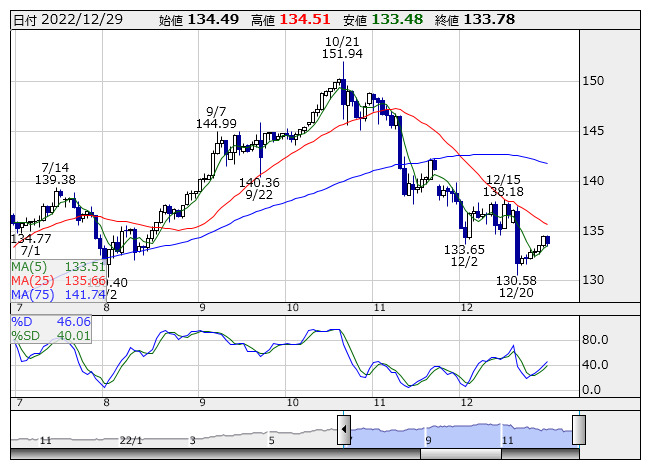 2022年12月29日18時01分 【通貨】外為:1ドル133円62銭前後とドル安・円高で推移 米ドル/円 <日足> Slowストキャス 「株探」多機能チャートより 29日の外国為替市場のドル円相場は午後6時時点で1ドル=133円62銭前後と、午後5時時点に比べ13銭のドル安・円高。ユーロ円は1ユーロ=142円03銭前後と2銭のユーロ安・円高と横ばい圏で推移している。 株探ニュース