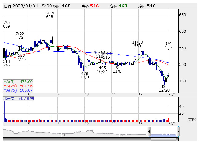 ASJ <日足> 「株探」多機能チャートより個別ではASJ<2351>、ELEMENTS<5246>、BTM<5247>がストップ高。エディア<3935>、スマレジ<4431>、日本スキー場開発<6040>、スマサポ<9342>など5銘柄は昨年来高値を更新。monoAI technology<5240>、アイズ<5242>、ウェルプレイド・ライゼスト<9565>、イーエムネットジャパン<7036>、海帆<3133>は値上がり率上位に買われた。