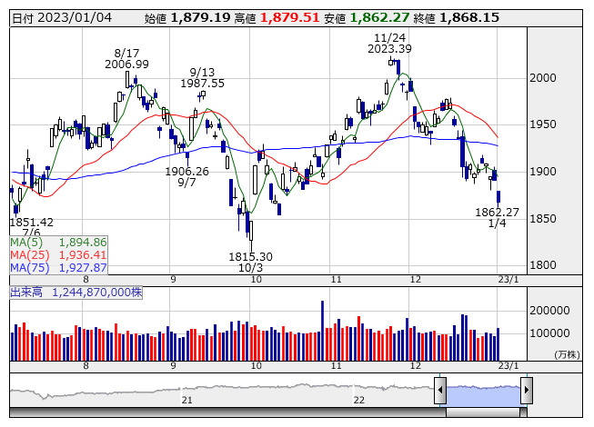 2023年01月05日08時46分 【市況】TOPIX先物:5日寄り付き=14ポイント高、1875ポイント TOPIX <日足> 「株探」多機能チャートより 5日8時45分、TOPIX先物期近2023年3月限は前日清算値比14ポイント高の1875ポイントで寄り付いた。前日のTOPIXの現物終値1868.15ポイントに対しては6.85ポイント高。夜間取引の終値1870.5ポイントに対しては4.5ポイント高となっている。 株探ニュース