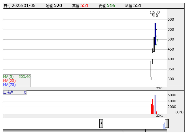 エレメンツ <日足> 「株探」多機能チャートより1月5日9時03分33秒現在、特別買い気配は21銘柄、特別売り気配は7銘柄となっている。