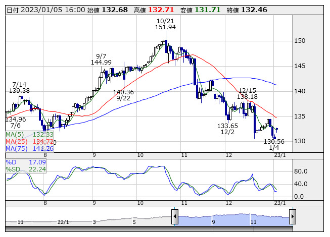 2023年01月05日16時01分 【通貨】外為:1ドル132円44銭前後と大幅なドル高・円安で推移 米ドル/円 <日足> Slowストキャス 「株探」多機能チャートより 5日の外国為替市場のドル円相場は午後4時時点で1ドル=132円44銭前後と、前日午後5時時点に比べ2円26銭の大幅なドル高・円安。ユーロ円は1ユーロ=140円42銭前後と2円50銭の大幅なユーロ高・円安で推移している。 株探ニュース