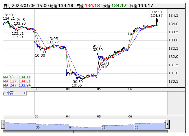 2023年01月06日15時01分 【通貨】外為:1ドル134円16銭前後と大幅なドル高・円安で推移 米ドル/円 <5分足> 「株探」多機能チャートより 6日の外国為替市場のドル円相場は午後3時時点で1ドル=134円16銭前後と、前日午後5時時点に比べ1円68銭の大幅なドル高・円安。ユーロ円は1ユーロ=141円02銭前後と54銭の大幅なユーロ高・円安で推移している。 株探ニュース
