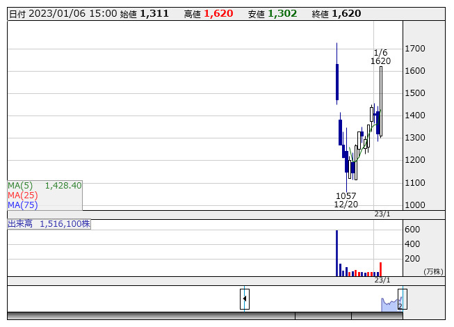 スマートD <日足> 「株探」多機能チャートより個別ではスマートドライブ<5137>、SERIOホールディングス<6567>がストップ高。monoAI technology<5240>は一時ストップ高と値を飛ばした。BTM<5247>、日本スキー場開発<6040>、ジャパニアス<9558>など5銘柄は昨年来高値を更新。イーエムネットジャパン<7036>、ブライトパス・バイオ<4594>、バンク・オブ・イノベーション<4393>、Delta-Fly Pharma<4598>、ビジネスコーチ<9562>は値上がり率上位に買われた。