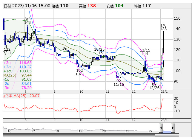 タメニー <日足> ボリンジャー/カイリ率 「株探」多機能チャートより●株価が+3σを上回った銘柄(市場人気順) ★株価の上げ足が速過ぎ、売りが出やすい銘柄
