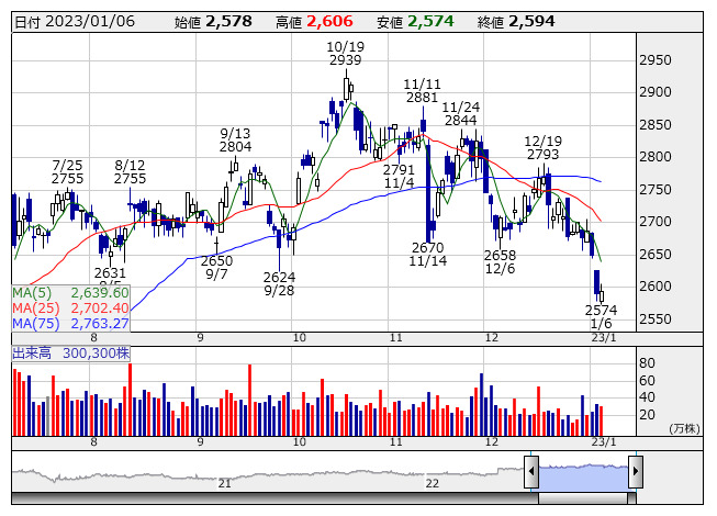 上組 <日足> 「株探」多機能チャートより(東証プライム上場 1824 銘柄対象)