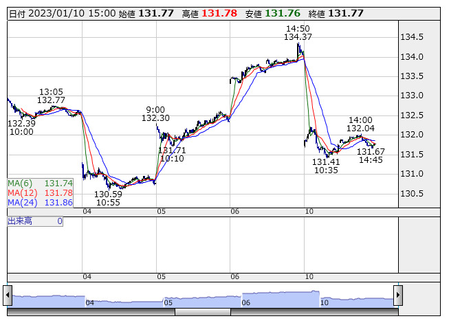 2023年01月10日15時01分 【通貨】外為:1ドル131円78銭前後とドル安・円高で推移 米ドル/円 <5分足> 「株探」多機能チャートより 10日の外国為替市場のドル円相場は午後3時時点で1ドル=131円78銭前後と、前日午後5時時点に比べ45銭のドル安・円高。ユーロ円は1ユーロ=141円53銭前後と43銭のユーロ高・円安で推移している。 株探ニュース