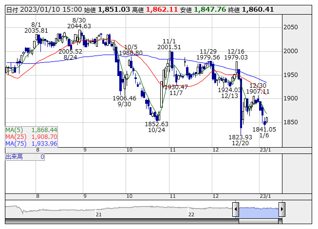 2023年01月10日15時17分 【市況】東証REIT指数先物:10日清算値=11.5ポイント高、1843.5ポイント REIT指数 <日足> 「株探」多機能チャートより 10日15時15分、東証REIT指数先物期近2023年3月限は前週末清算値比11.5ポイント高の1843.5ポイントで取引を終えた。出来高は291枚だった。この日の東証REIT指数の現物終値1860.41ポイントに対しては16.91ポイント安。 株探ニュース