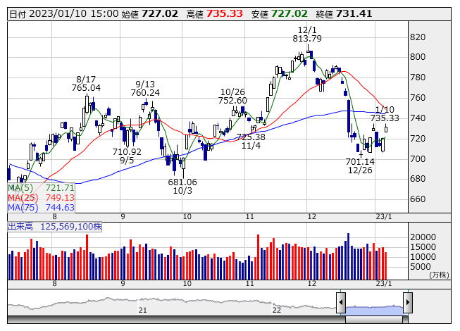 2023年01月10日15時17分 【市況】マザーズ先物:10日清算値=13ポイント高、724ポイント マザーズ指数 <日足> 「株探」多機能チャートより 10日15時15分、東証マザーズ指数先物期近2023年3月限は前週末清算値比13ポイント高の724ポイントで取引を終えた。出来高は7070枚だった。この日の東証マザーズ指数の現物終値731.41ポイントに対しては7.41ポイント安。 株探ニュース