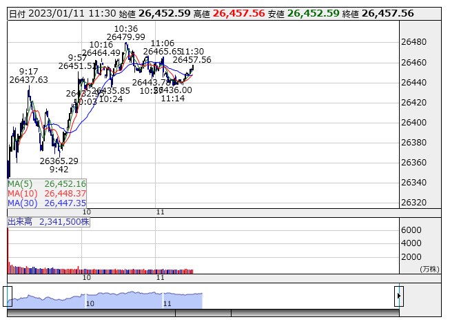日経平均 <1分足> 「株探」多機能チャートより個別ではUBS ユーロ圏大型株50 <1385> が新高値。国際のETF VIX短期先物指数 <1552> 、iシェアーズ グリーンJリート ETF <2852> が新安値をつけた。