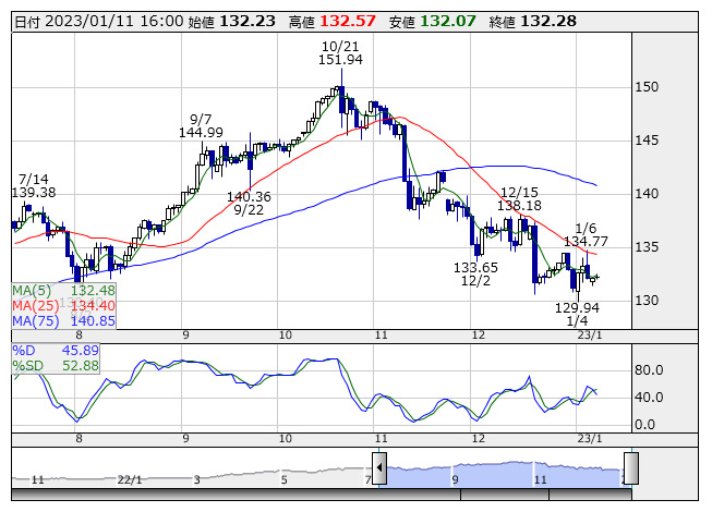 2023年01月11日16時01分 【通貨】外為:1ドル132円31銭前後と小幅なドル高・円安で推移 米ドル/円 <日足> Slowストキャス 「株探」多機能チャートより 11日の外国為替市場のドル円相場は午後4時時点で1ドル=132円31銭前後と、前日午後5時時点に比べ9銭の小幅なドル高・円安。ユーロ円は1ユーロ=142円18銭前後と33銭のユーロ高・円安で推移している。 株探ニュース
