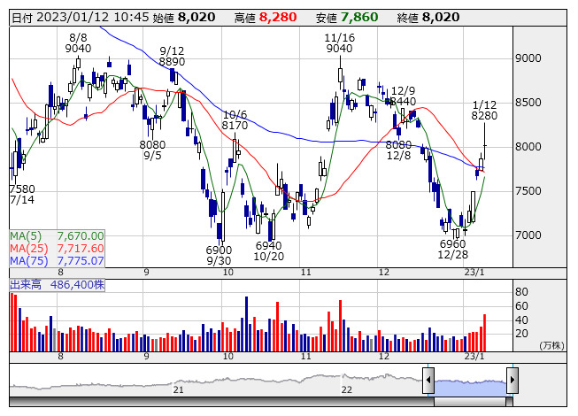 ローツェ <日足> 「株探」多機能チャートより同社は期末配当予想について、従来の見通しから25円増額し、前期末比で70円増配の135円に見直した。あわせて発表した23年2月期第3四半期累計(3~11月)の連結決算は、売上高が前年同期比53.2%増の713億8200万円、最終利益が同2.3倍の196億6600万円だった。半導体関連装置の販売が好調に推移した。