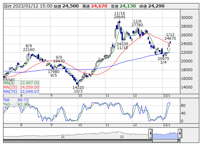 レーザーテク <日足> Fastストキャス 「株探」多機能チャートより●25日線【上抜き】銘柄(市場人気順) ★上昇トレンドに転換する兆しが出てきた銘柄