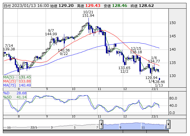 2023年01月13日16時01分 【通貨】外為:1ドル128円54銭前後と大幅なドル安・円高で推移 米ドル/円 <日足> Slowストキャス 「株探」多機能チャートより 13日の外国為替市場のドル円相場は午後4時時点で1ドル=128円54銭前後と、前日午後5時時点に比べ3円05銭の大幅なドル安・円高。ユーロ円は1ユーロ=139円40銭前後と2円21銭の大幅なユーロ安・円高で推移している。 株探ニュース